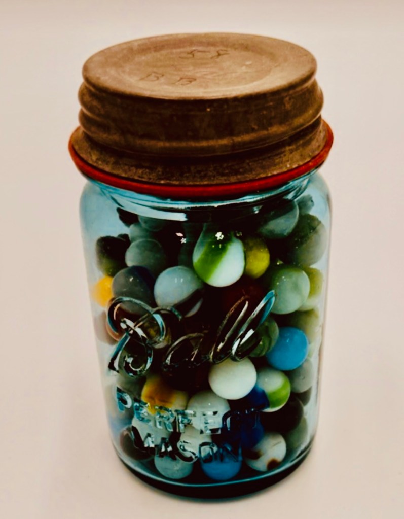 One day we all went to a flea market where I spotted a large blue mason jar filled with old marbles: cat’s eyes, red devils, yellow agate, blue and green slags, and a few rare shooters. There must have been two hundred marbles in that jar, and it cost only two dollars. My sister collected marbles, so I bought them.